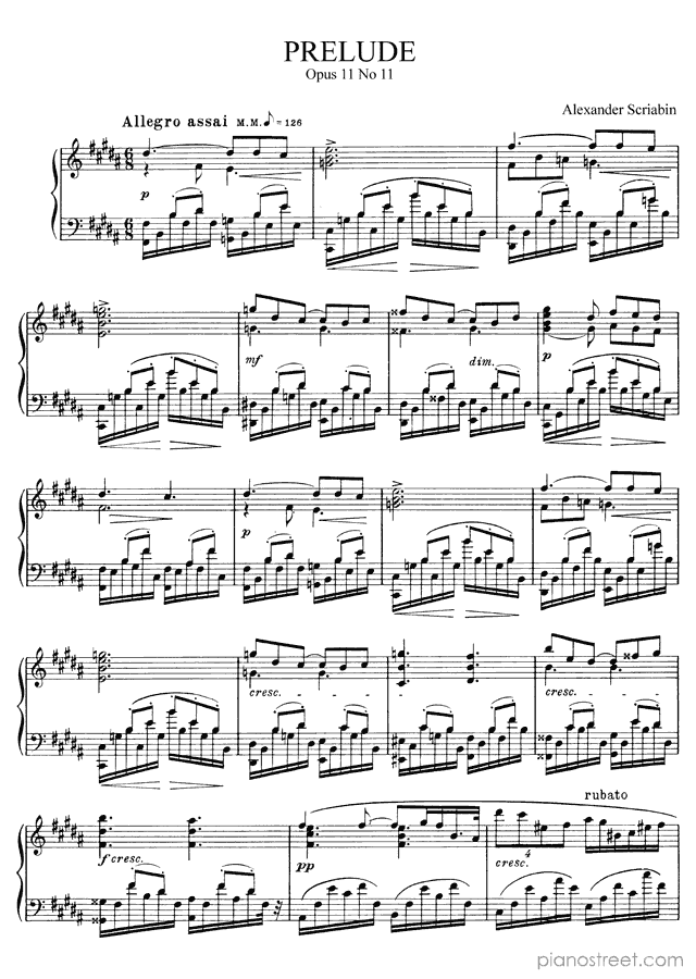 DOWNLOAD Prelude in B Major Op. 11 No. 11 by Alexander Scriabin (published in 1895) . High quality classical piano scores from the Piano Street sheet music library.