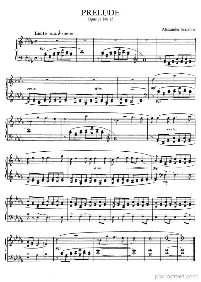 Alexander Scriabin: Prelude Op. 11 No. 15 in D-flat Major from Preludes - piano sheet music to print instantly. This piece is level 8+ and was composed during the Late Romantic period.