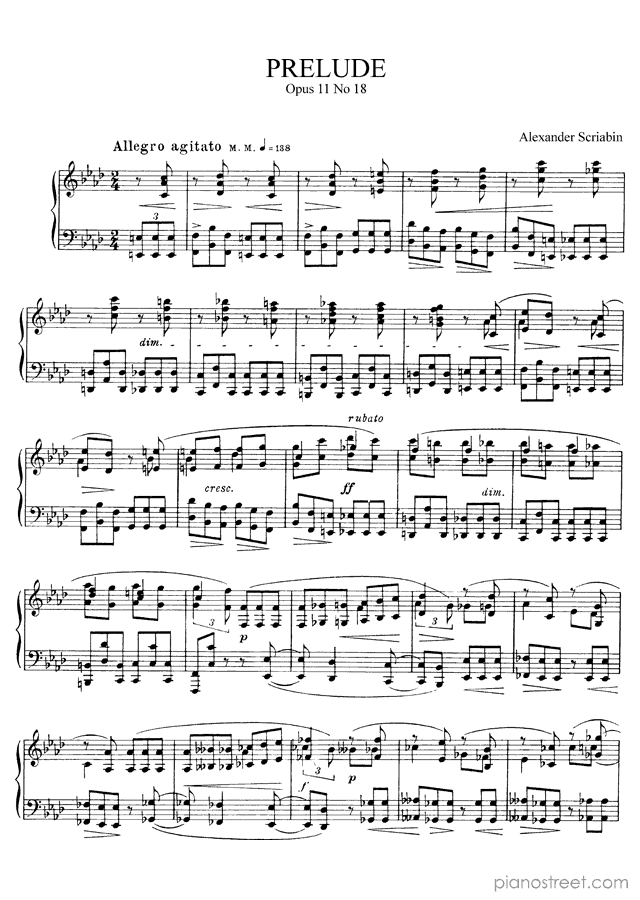 Prelude in F Minor - Op. 11 No. 18 is a piano piece by the late romantic composer Alexander Scriabin who lived between the years 1872 and 1915.