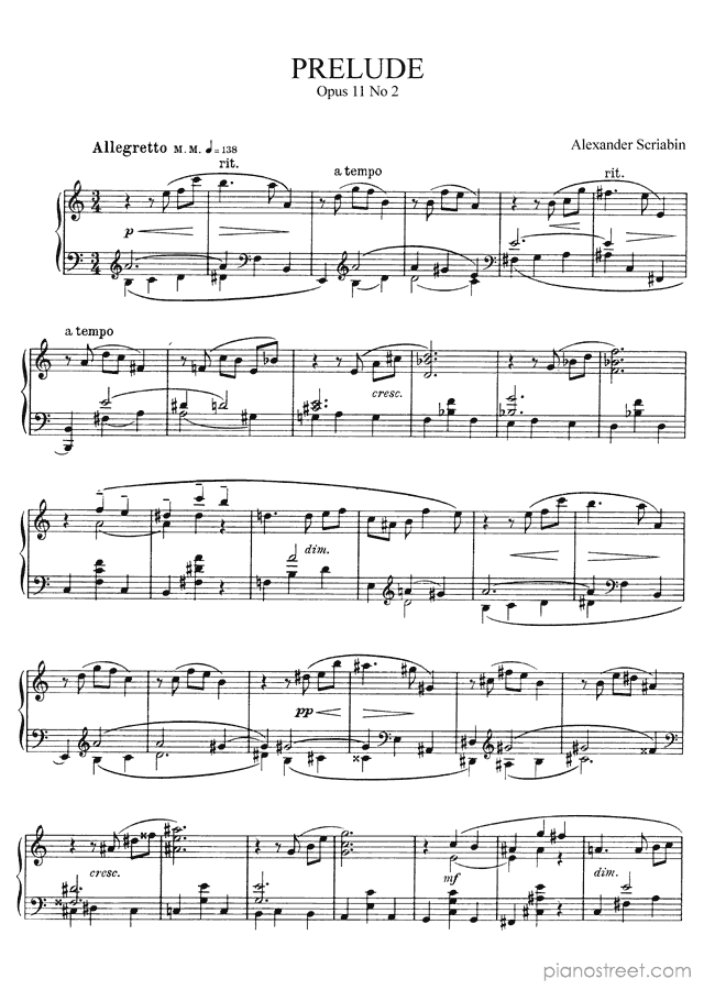 Prelude Op. 11 No. 2, a composition by the late romantic composer Alexander Scriabin who was born in 1872 and died in 1915. The piano score of this piece was first published in 1895 and is part of Scriabin's Preludes.
