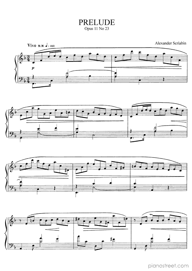 Piano sheet music and recordings. This piece is from Preludes by Alexander Scriabin: Prelude Op. 11 No. 23 in F Major (published in 1895) . Level 8+, Period: Late Romantic