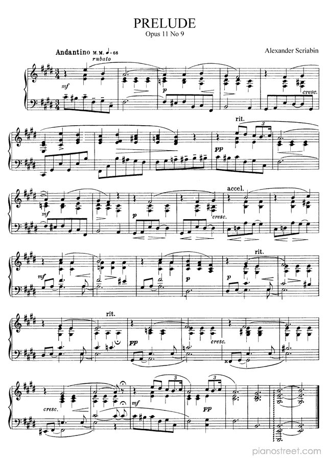 Prelude in E Major - Op. 11 No. 9 is a piano piece by the late romantic composer Alexander Scriabin who lived between the years 1872 and 1915.