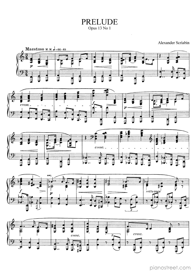 Scriabin: Prelude Op. 13 No. 1 in C Major (published in 1895) . DOWNLOAD piano sheet music from Piano Street digital sheet music library.