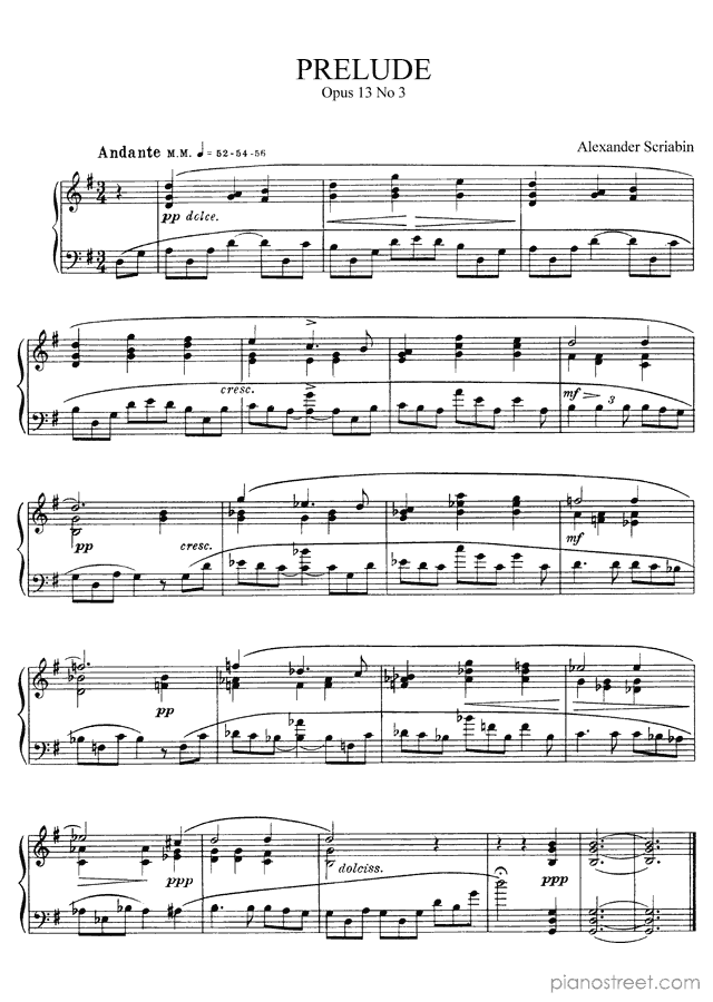 Prelude in G Major - Op. 13 No. 3 is a piano piece by the late romantic composer Alexander Scriabin who lived between the years 1872 and 1915.