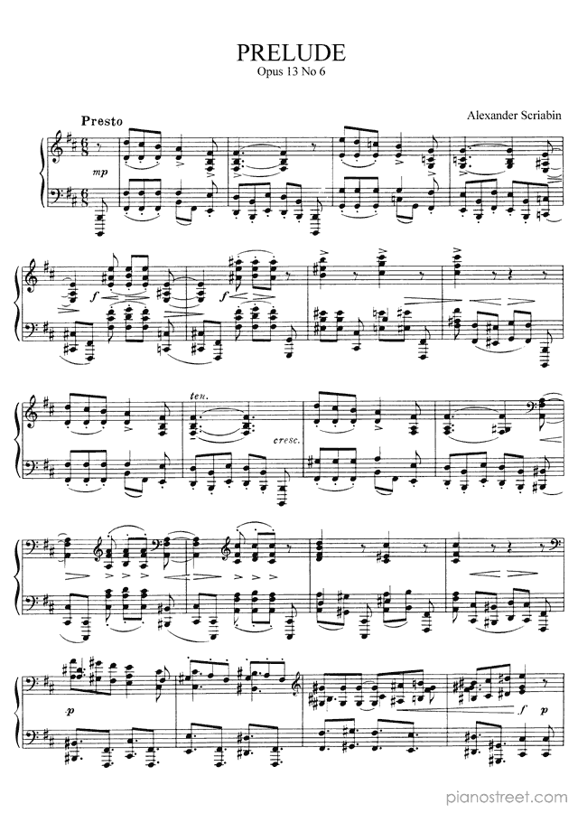 Downloadable piano sheet music from Preludes by Alexander Scriabin to print: Prelude Op. 13 No. 6 in B Minor (published in 1895)