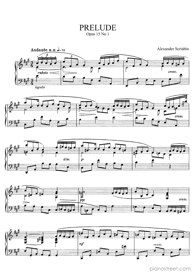 Prelude Op. 15 No. 1 in A Major, a composition by the late romantic composer Alexander Scriabin who was born in 1872 and died in 1915. The piano score of this piece was first published in 1895 and is part of Scriabin's Preludes.