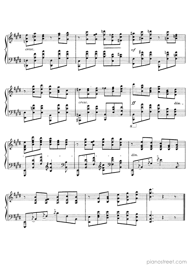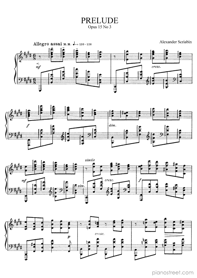Piano sheet music and recordings. This piece is from Preludes by Alexander Scriabin: Prelude Op. 15 No. 3 in E Major (published in 1895) . Level 8+, Period: Late Romantic