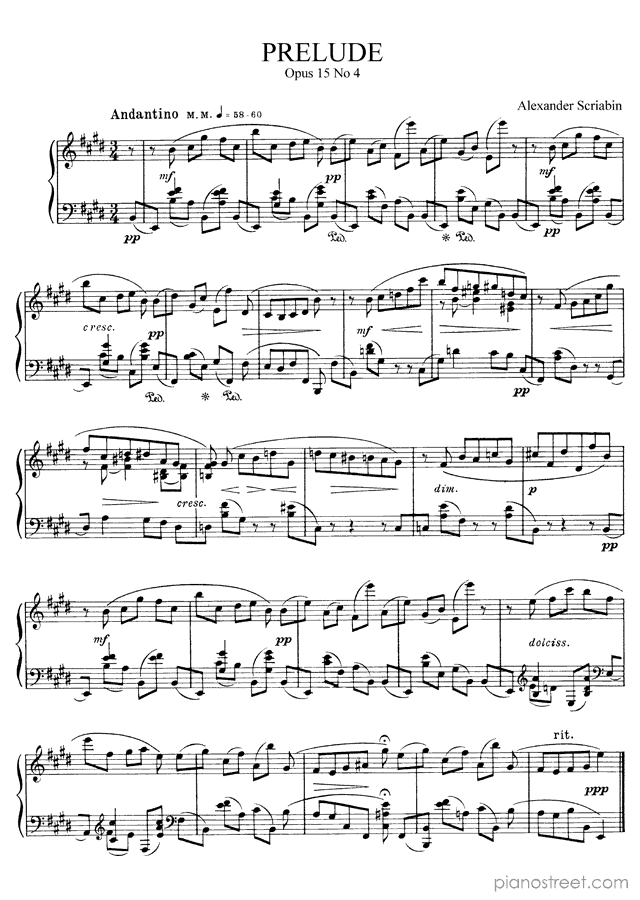 Alexander Scriabin: Prelude Op. 15 No. 4 in E Major from Preludes - piano sheet music to print instantly. This piece is level 8+ and was composed during the Late Romantic period.