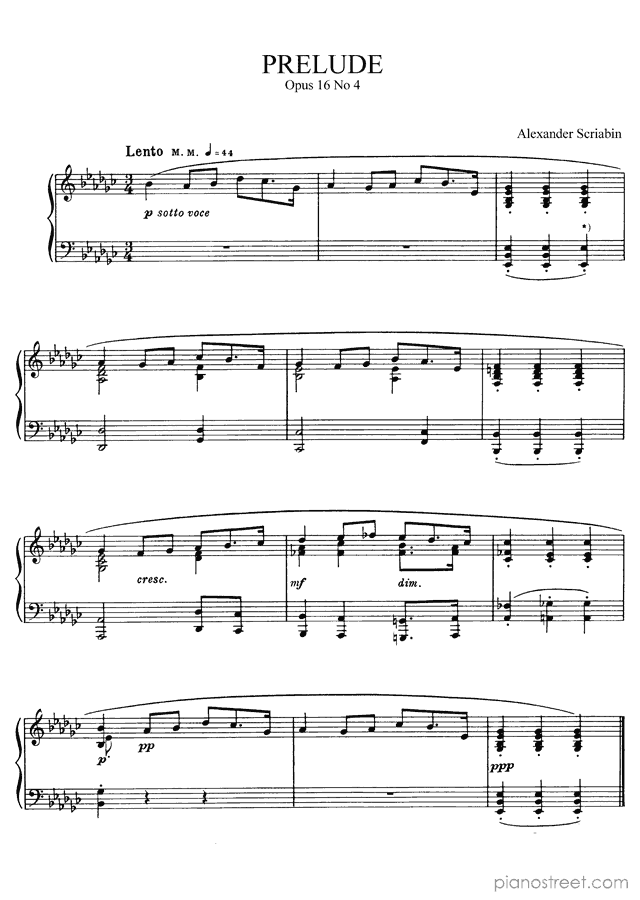 DOWNLOAD Prelude in E-flat Minor Op. 16 No. 4 by Alexander Scriabin (published in 1895) . High quality classical piano scores from the Piano Street sheet music library.