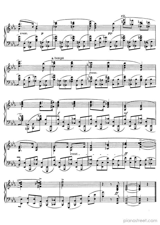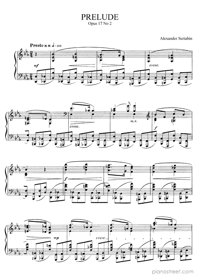 Late Romantic piano sheet music by Alexander Scriabin to download and print instantly: Prelude Op. 17 No. 2 in the key of . Level 8+, compositional type: Piece (published in 1896)