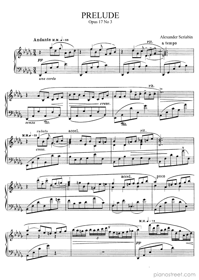 Piano sheet music and recordings. This piece is from Preludes by Alexander Scriabin: Prelude Op. 17 No. 3 in D-flat Major (published in 1896) . Level 8+, Period: Late Romantic