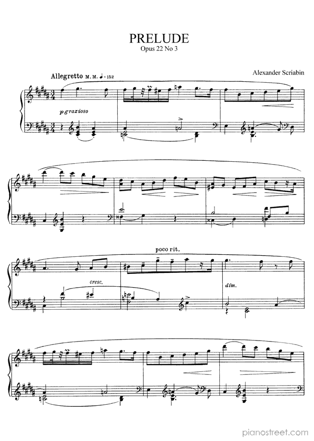 Downloadable piano sheet music from Preludes by Alexander Scriabin to print: Prelude Op. 22 No. 3 in B Major (published in 1897)
