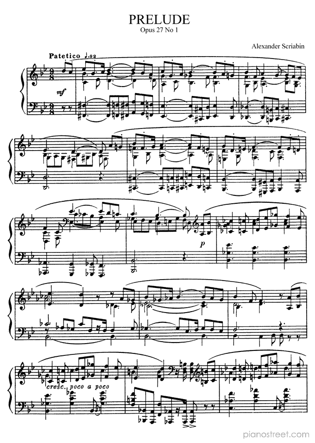 Late Romantic piano sheet music by Alexander Scriabin to download and print instantly: Prelude Op. 27 No. 1 in the key of . Level 8+, compositional type: Piece (published in 1900)