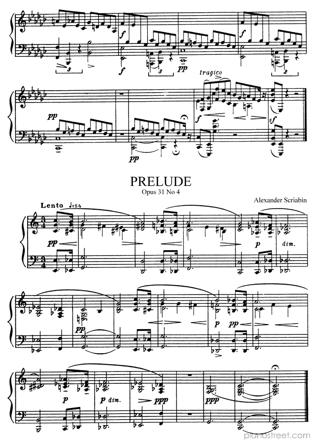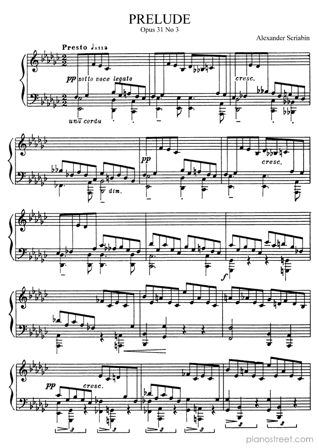 Prelude in E-flat Minor Op. 31 No. 3 by Alexander Scriabin. Sheet music and recordings of thousands of piano pieces by Alexander Scriabin and many other famous composers to view in your digital device, print out or listen to.