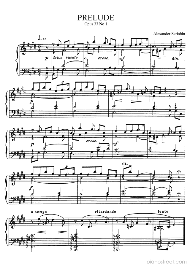DOWNLOAD: Alexander Scriabin - Prelude Op. 33 No. 1 in E Major ( from Preludes by Scriabin). Piano sheet music to print immediately or to view in mobile devices.