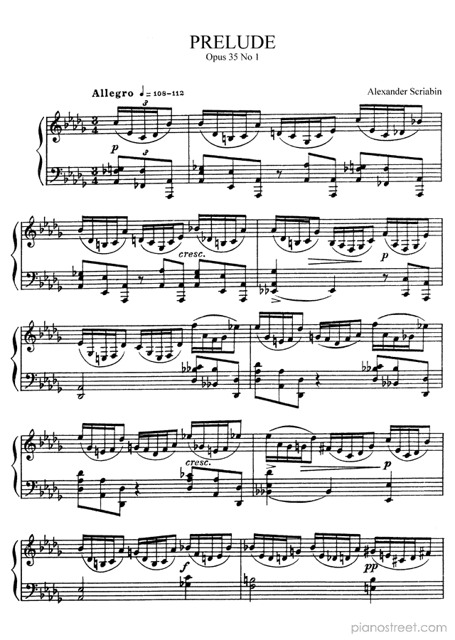 Late Romantic piano sheet music by Alexander Scriabin to download and print instantly: Prelude Op. 35 No. 1 in the key of . Level 8+, compositional type: Piece (published in 1903)