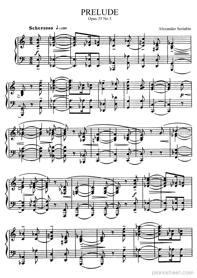 Alexander Scriabin: Prelude Op. 35 No. 3 in C Major from Preludes - piano sheet music to print instantly. This piece is level 8+ and was composed during the Late Romantic period.