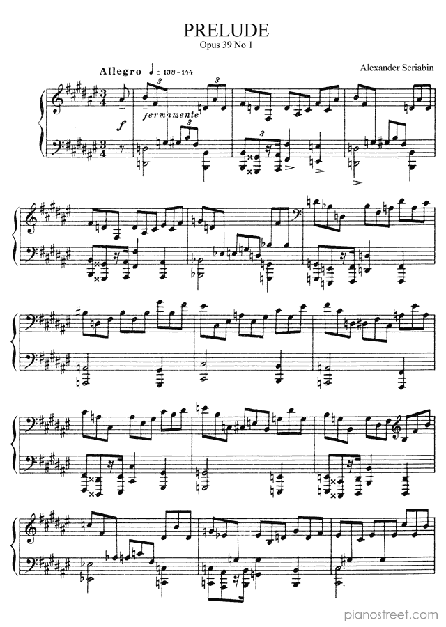 DOWNLOAD Prelude in F-sharp Major Op. 39 No. 1 by Alexander Scriabin (published in 1903) . High quality classical piano scores from the Piano Street sheet music library.
