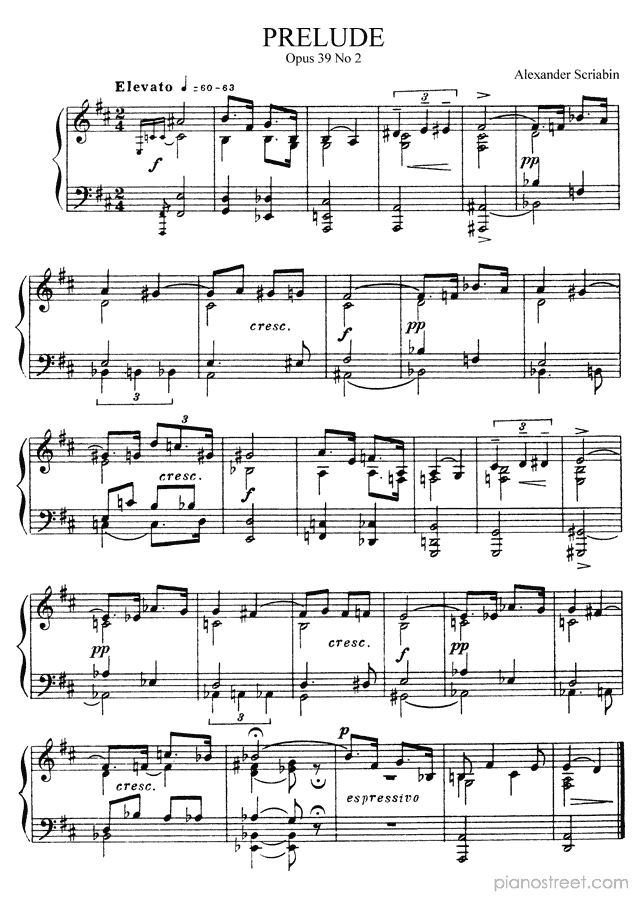 Prelude Op. 39 No. 2 in D Major, a composition by the late romantic composer Alexander Scriabin. The piano score of this piece was first published in 1903 and is part of Preludes by Scriabin.