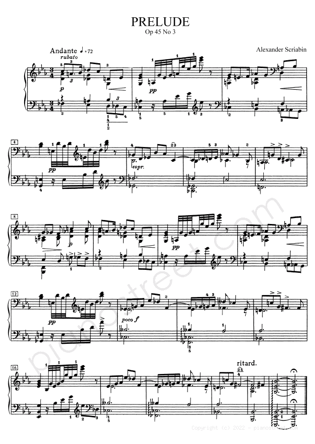 Downloadable piano sheet music from Preludes by Alexander Scriabin to print: Prélude Op. 45 No. 3 in E-flat Major (published in 1905)