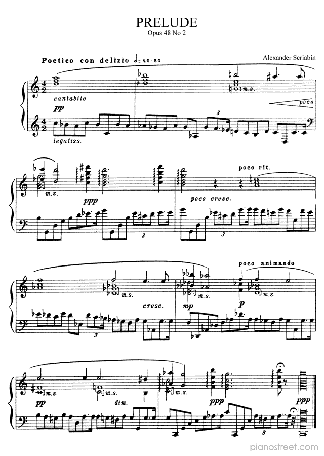 Alexander Scriabin: Prelude Op. 48 No. 2 in C Major from Preludes - piano sheet music to print instantly. This piece is level 8+ and was composed during the Late Romantic period.
