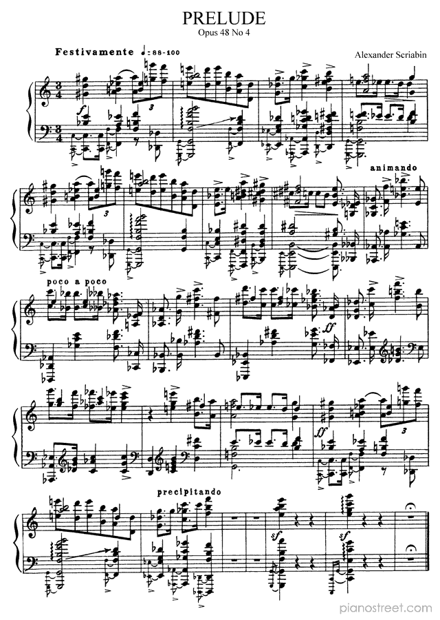 Prelude in C Major Op. 48 No. 4 by Alexander Scriabin. Sheet music and recordings of thousands of piano pieces by Alexander Scriabin and many other famous composers to view in your digital device, print out or listen to.