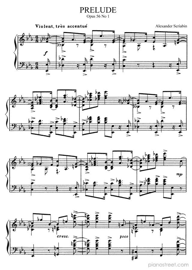 DOWNLOAD Prelude in E-flat Major Op. 56 No. 1 by Alexander Scriabin (published in 1906) . High quality classical piano scores from the Piano Street sheet music library.