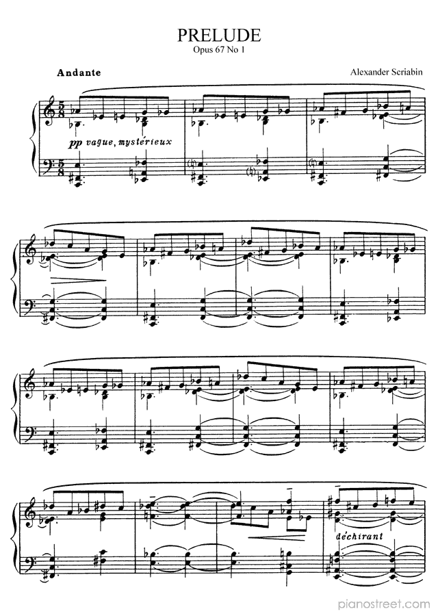 Prelude Op. 67 No. 1, a composition by the late romantic composer Alexander Scriabin who was born in 1872 and died in 1915. The piano score of this piece was first published in 1913 and is part of Scriabin's Preludes.