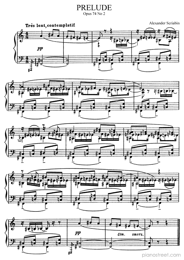 Alexander Scriabin: Prelude Op. 74 No. 2 from Preludes - piano sheet music to print instantly. This piece is level 8+ and was composed during the Late Romantic period.