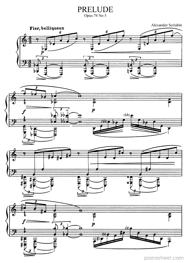 Prelude - Op. 74 No. 5 is a piano piece by the late romantic composer Alexander Scriabin who lived between the years 1872 and 1915.