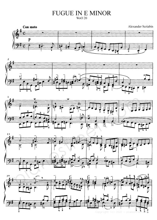 Fugue in E Minor WoO 20 by Alexander Scriabin. Sheet music and recordings of thousands of piano pieces by Alexander Scriabin and many other famous composers to view in your digital device, print out or listen to.