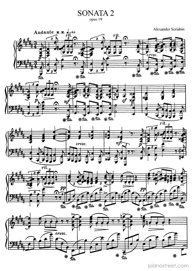 Alexander Scriabin, one of the prominent composers active in the Late Romantic era, has written this piece titled Sonata 2 Op. 19 in G-sharp Minor from Sonatas. The composition is categorized as "Sonata" in Piano Street's sheet music library and the level of difficulty is 8+.