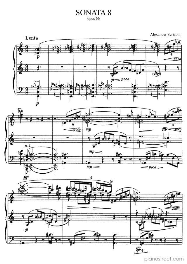 Sonata 8 Op. 66, a composition by the late romantic composer Alexander Scriabin. The piano score of this piece was first published in 1913 and is part of Sonatas by Scriabin.