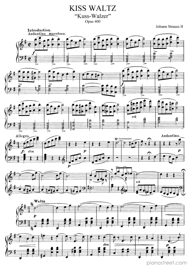 DOWNLOAD Kiss Waltz in G Major Op. 400 by Johann Strauss II (published in 1882) . High quality classical piano scores from the Piano Street sheet music library.