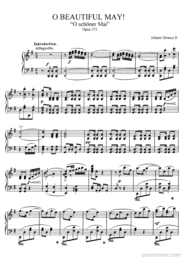 O Beautiful May Op. 375 in G Major, a composition by the early romantic composer Johann Strauss II who was born in 1825 and died in 1899. The piano score of this piece was first published in 1877 and is part of Strauss II's Waltzes.