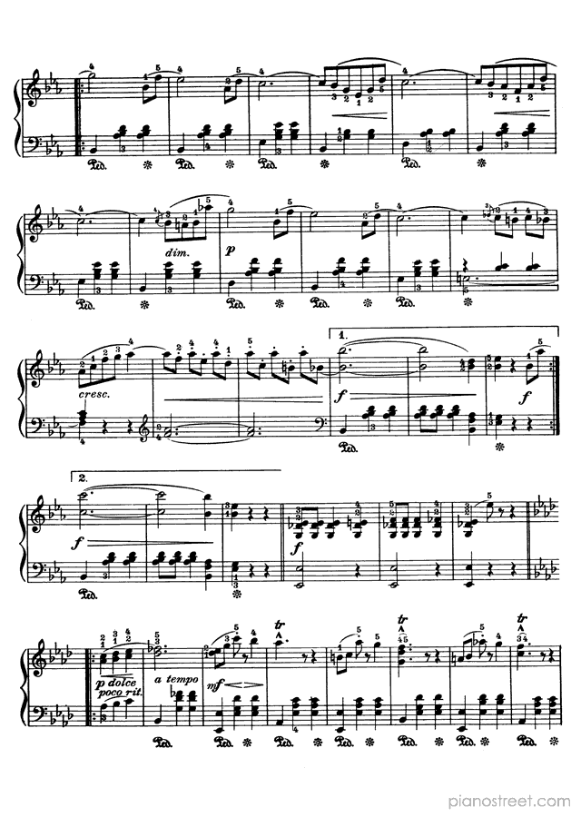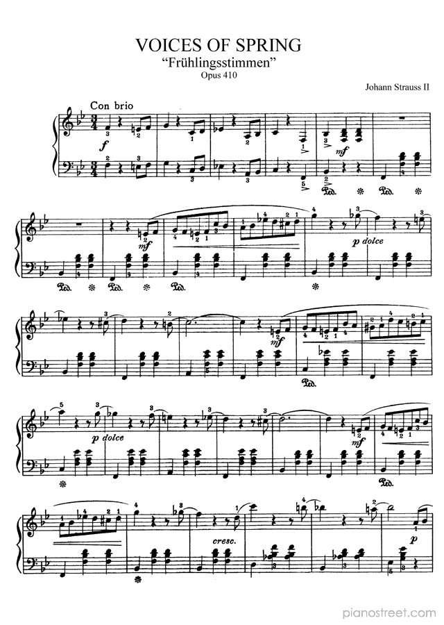 This piece is composed by Johann Strauss II and was published in 1883. Title: Voices of Spring, Op. 410 in B-flat Major from Waltzes. The difficulty level is around ABRSM grade 6 and it belongs to the Early Romantic period.