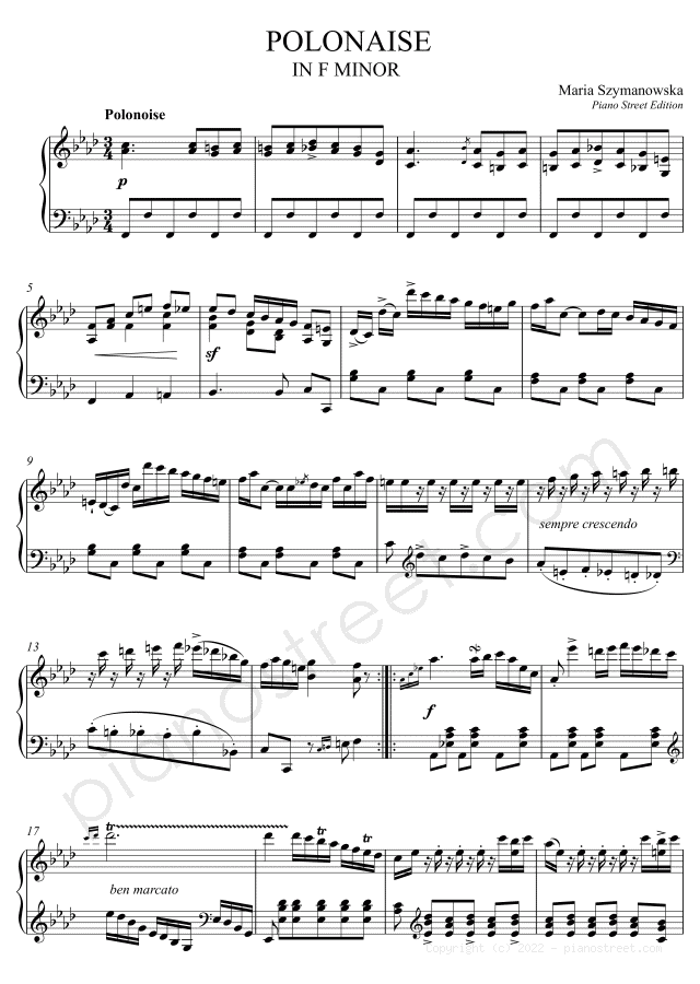 Szymanowska: Polonaise in F Minor (published in 1820) . DOWNLOAD piano sheet music from Piano Street digital sheet music library.