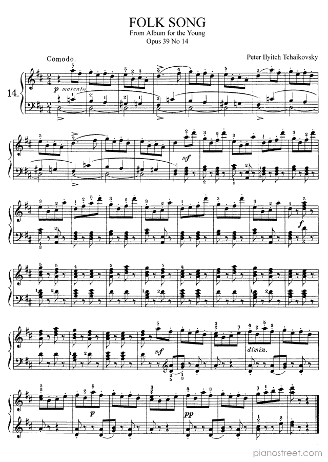 Peter Ilyitch Tchaikovsky: Folk Song Op. 39 No. 14 in D Major from Album for the Young - piano sheet music to print instantly. This piece is level 6 and was composed during the Late Romantic period.