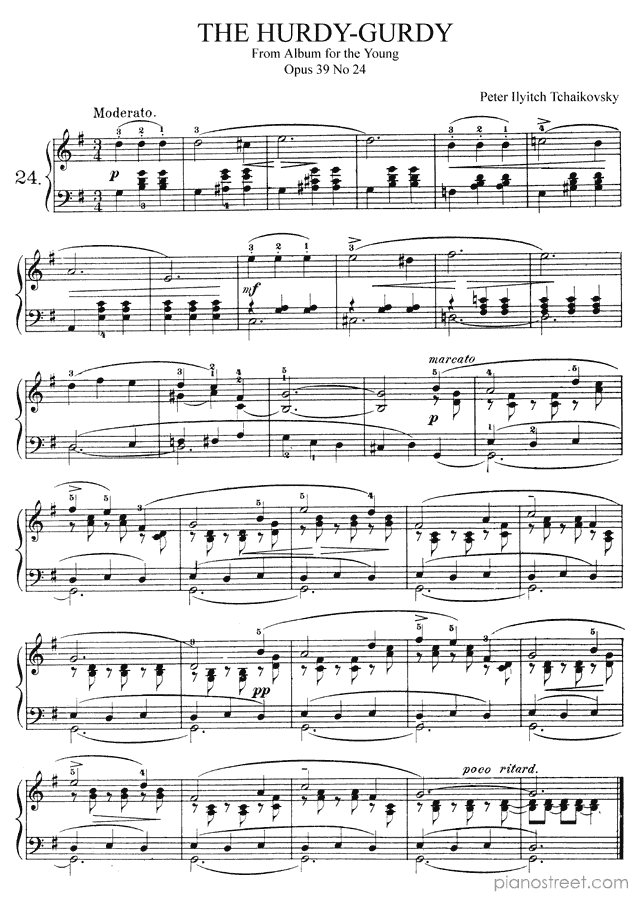 Peter Ilyitch Tchaikovsky: The Hurdy-Gurdy Op. 39 No. 24 in G Major from Album for the Young - piano sheet music to print instantly. This piece is level 5 and was composed during the Late Romantic period.