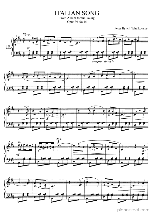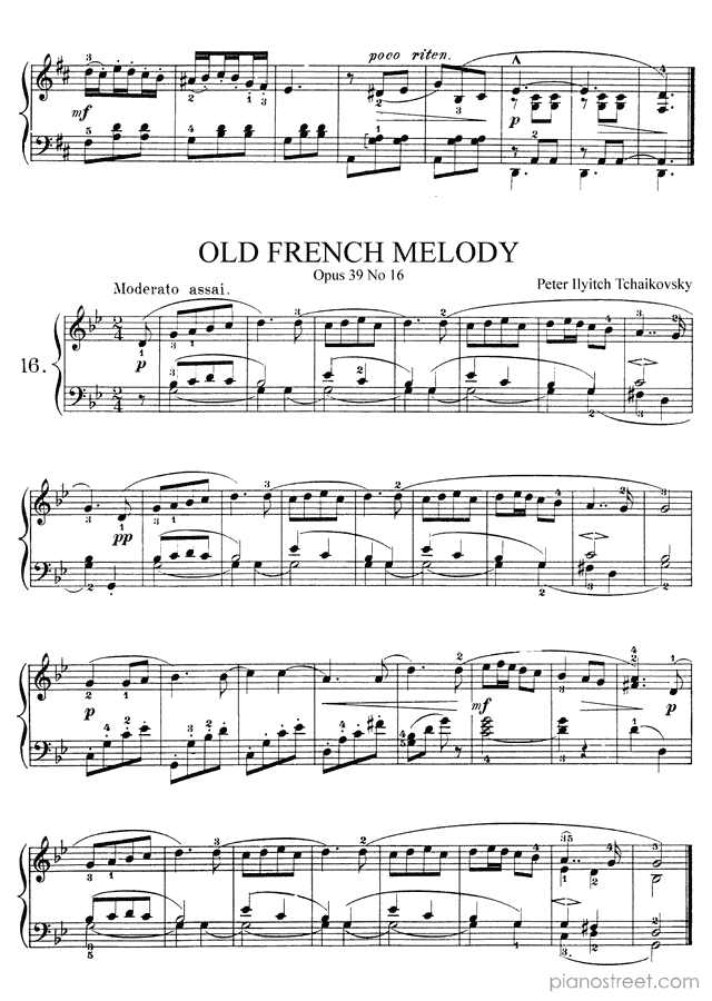 Old French Melody in G Minor Op. 39 No. 16 by Peter Ilyitch Tchaikovsky. Sheet music and recordings of thousands of piano pieces by Peter Ilyitch Tchaikovsky and many other famous composers to view in your digital device, print out or listen to.