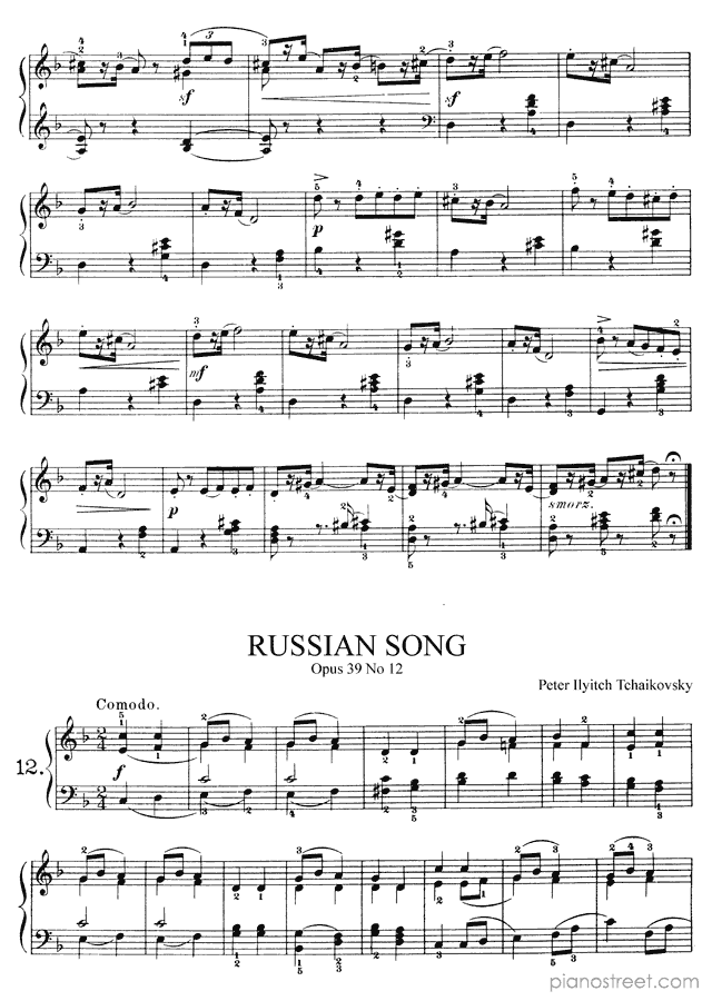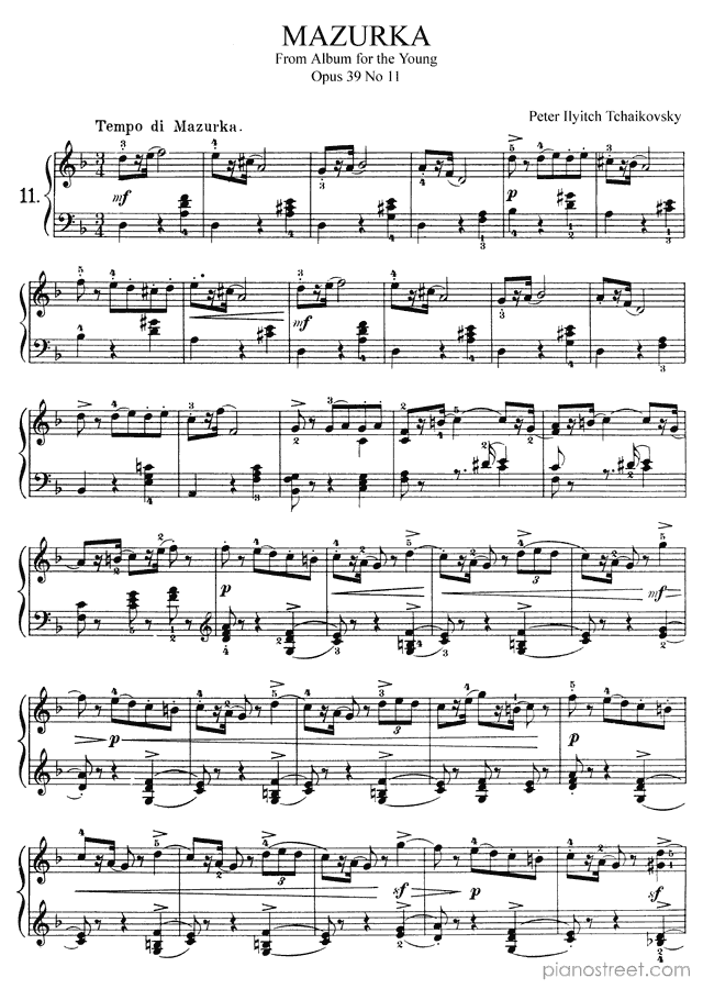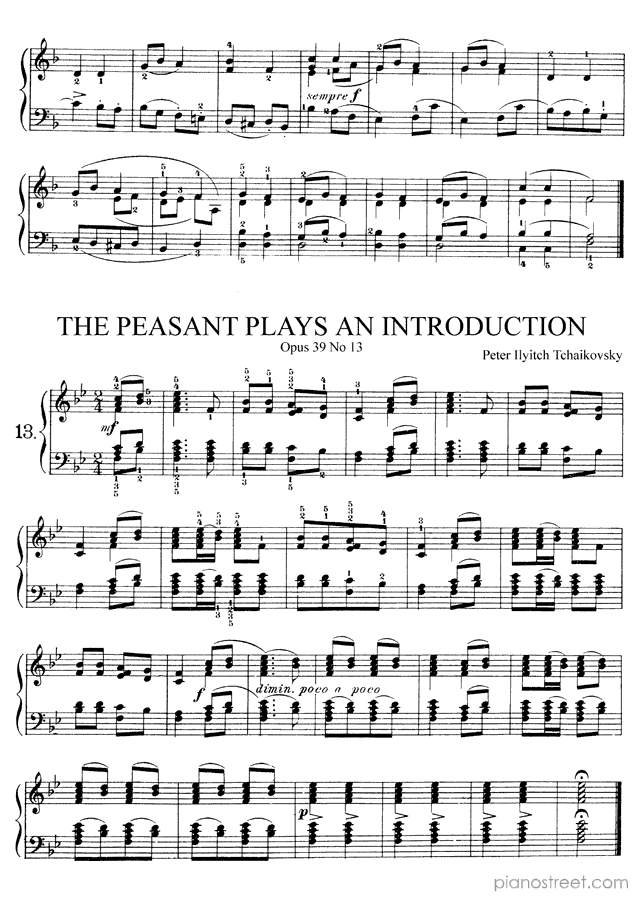 Piano sheet music and recordings. This piece is from Album for the Young by Peter Ilyitch Tchaikovsky: The Peasant Plays an Introduction Op. 39 No. 13 in B-flat Major (published in 1878) . Level 5, Period: Late Romantic