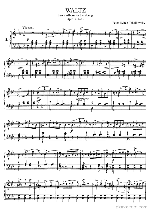 DOWNLOAD Waltz in E-flat Major Op. 39 No. 9 by Peter Ilyitch Tchaikovsky (published in 1878) . High quality classical piano scores from the Piano Street sheet music library.