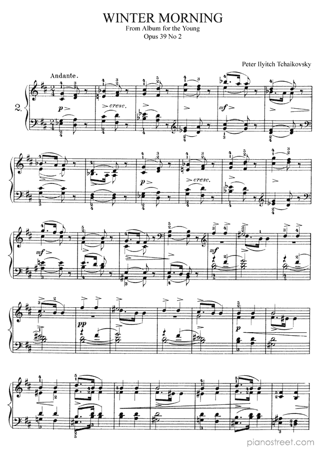 Late Romantic piano sheet music by Peter Ilyitch Tchaikovsky to download and print instantly: Winter Morning Op. 39 No. 2 in the key of . Level 6, compositional type: Piece (published in 1878)