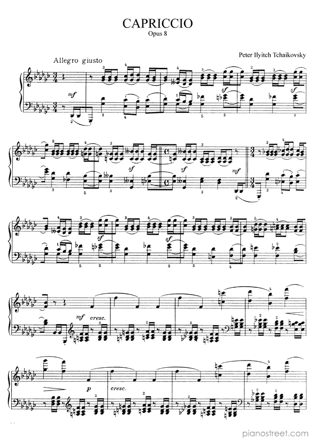 Piano sheet music and recordings. This piece is by Peter Ilyitch Tchaikovsky: Capriccio Op. 8 in G-flat Major (published in 1870) . Level 8+, Period: Late Romantic