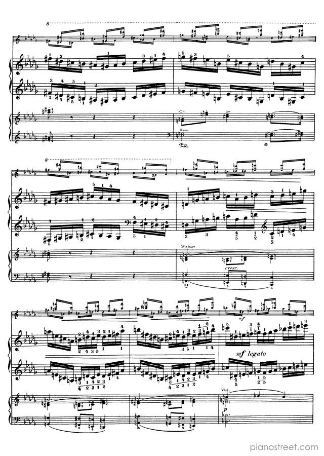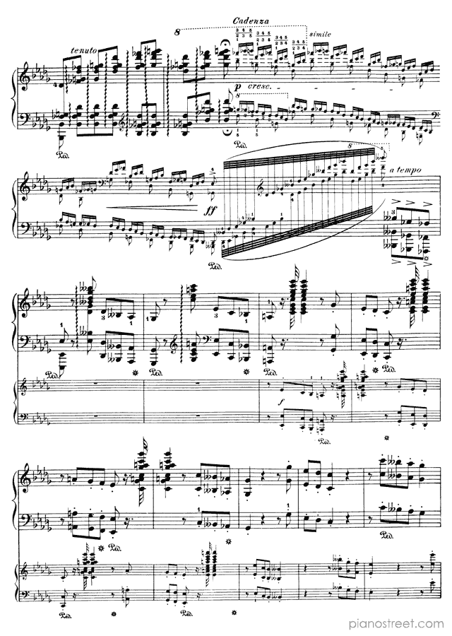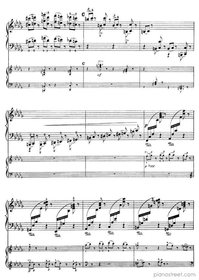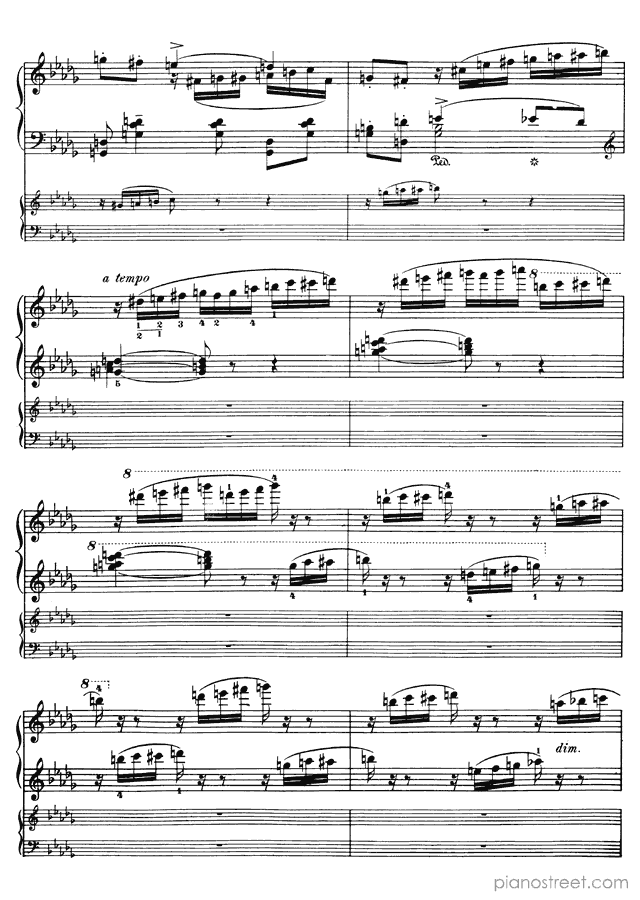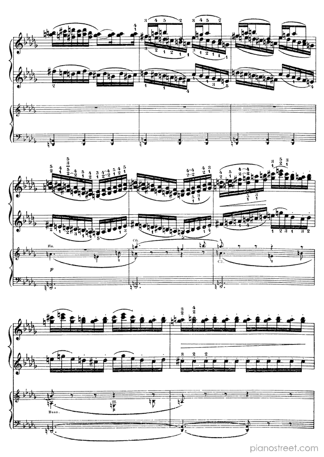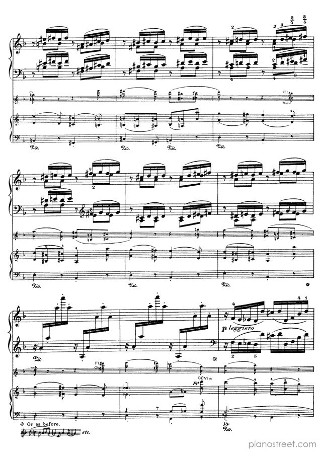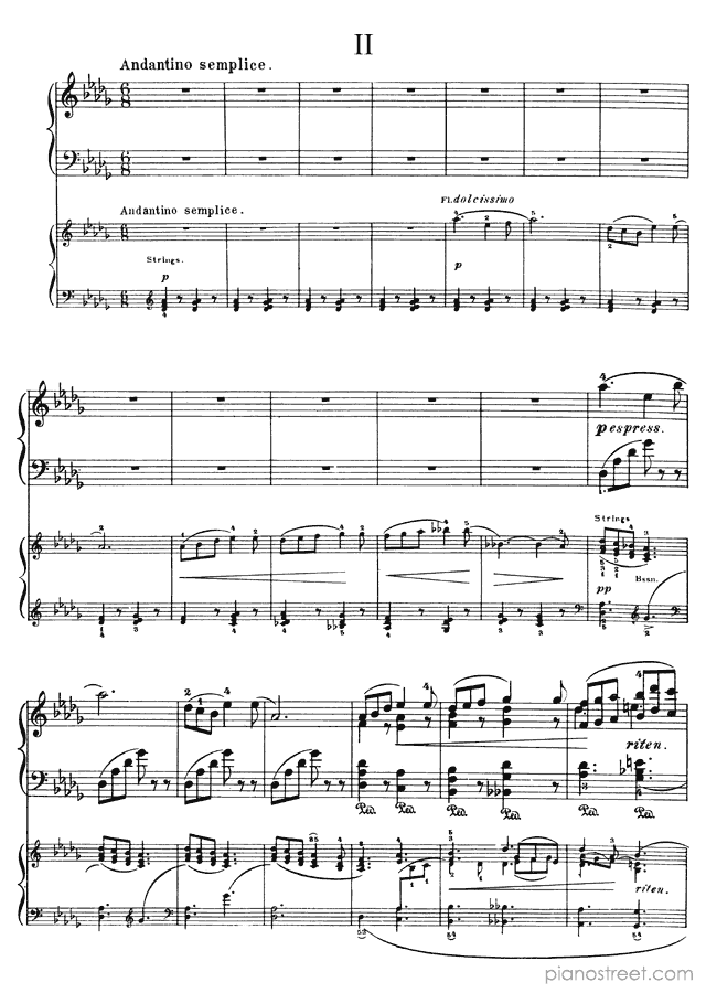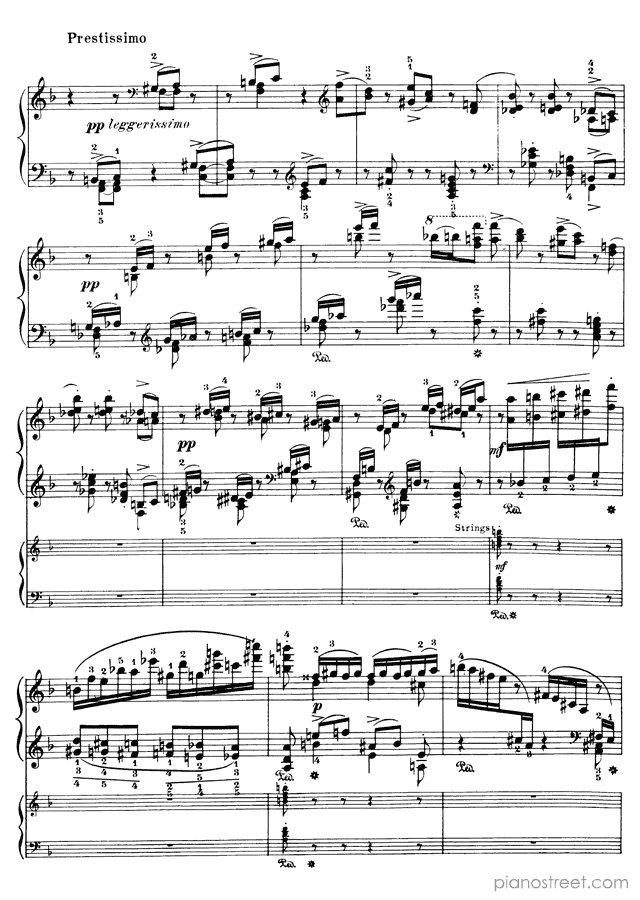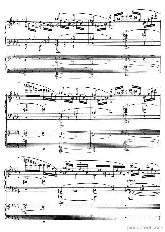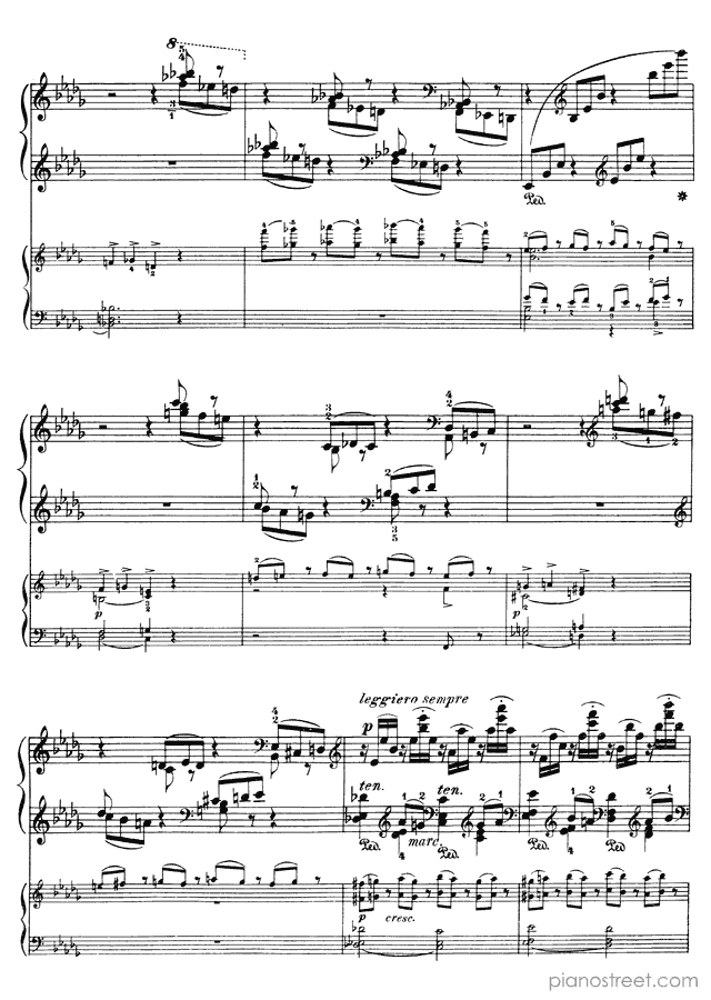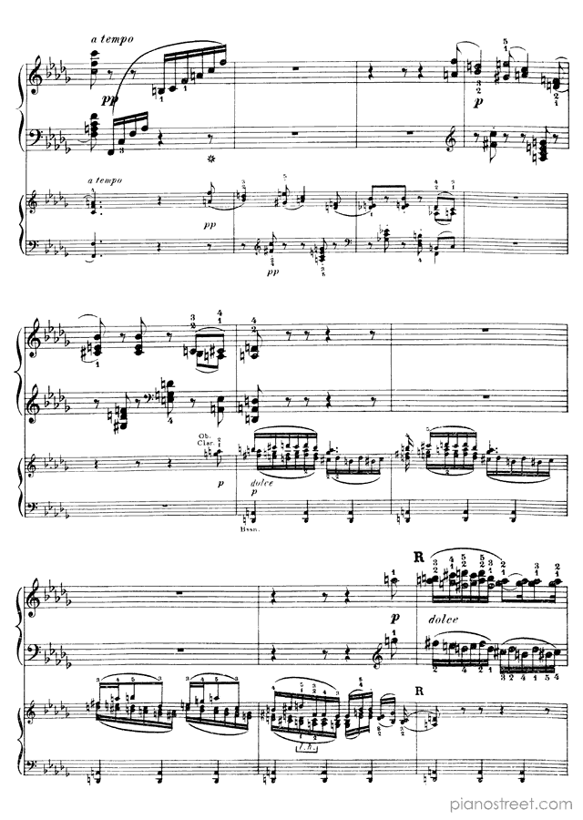 The second movement is in D flat major and A-B-A form. The outer sections are serene, almost pastoral, and, similar to the first movement, feature continuous interplay between the orchestra and the piano. The middle section is marked Prestissimo and flits and twirls with spritelike caprice, creating a contrast in tempo and character without detracting from the overall impression of a captured moment of contented happiness. The final movement is in rondo form and is decisively energetic and upbeat despite the minor key, thanks to numerous syncopations and middle-of-the-bar accents. Like the previous movements, capricious virtuosity contrasted with lyrical secondary themes interplay throughout. A virtuosic cadenza in octaves leads into the piano and orchestra coming together in a final passionate outburst, creating a glorious ending to a glittering and exciting concerto.