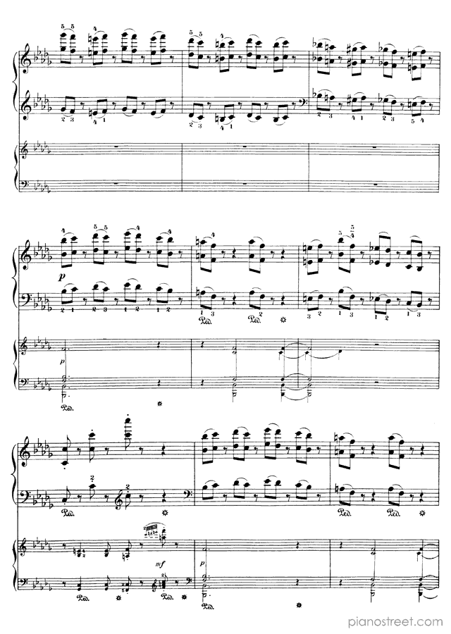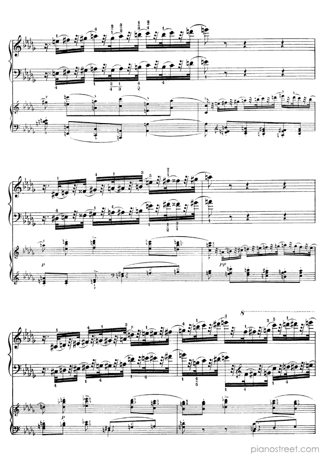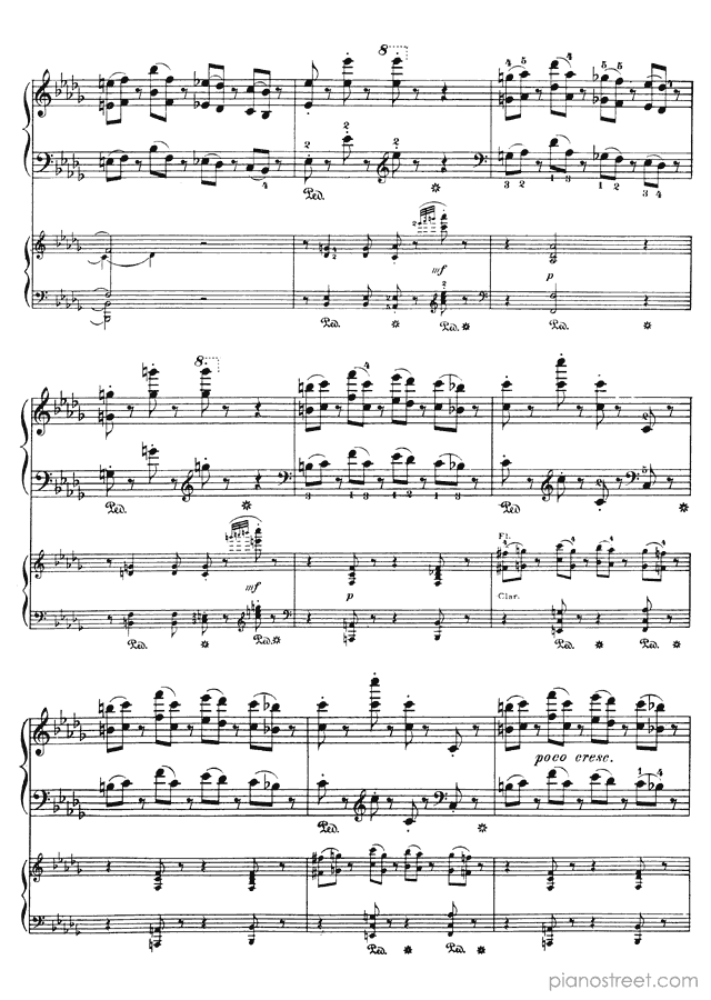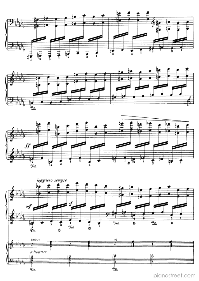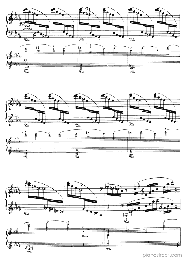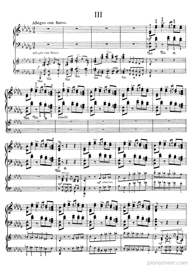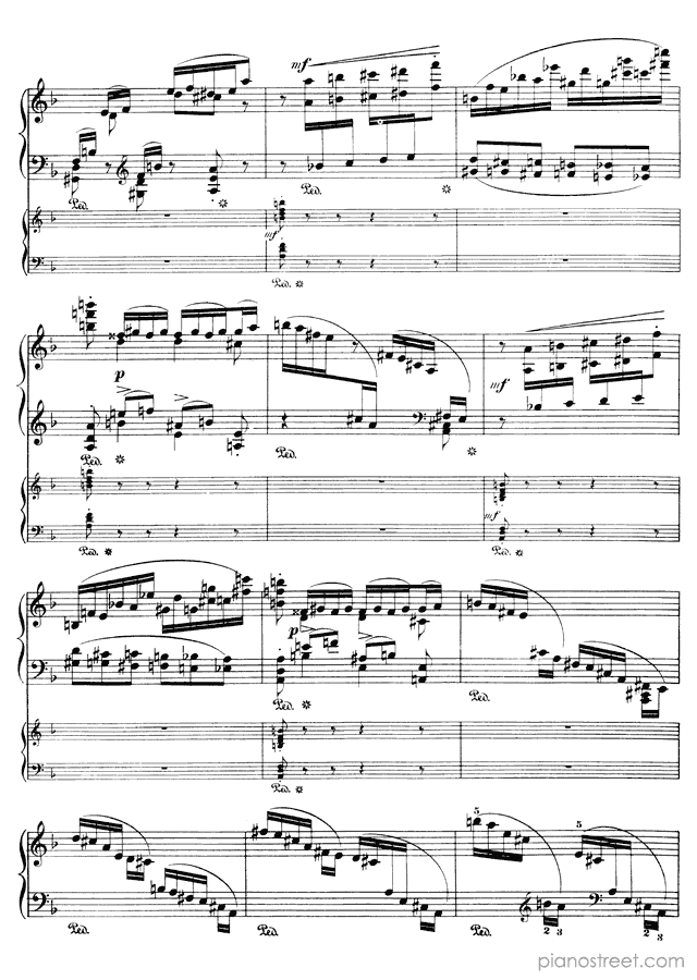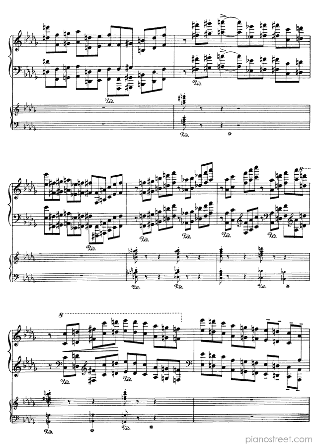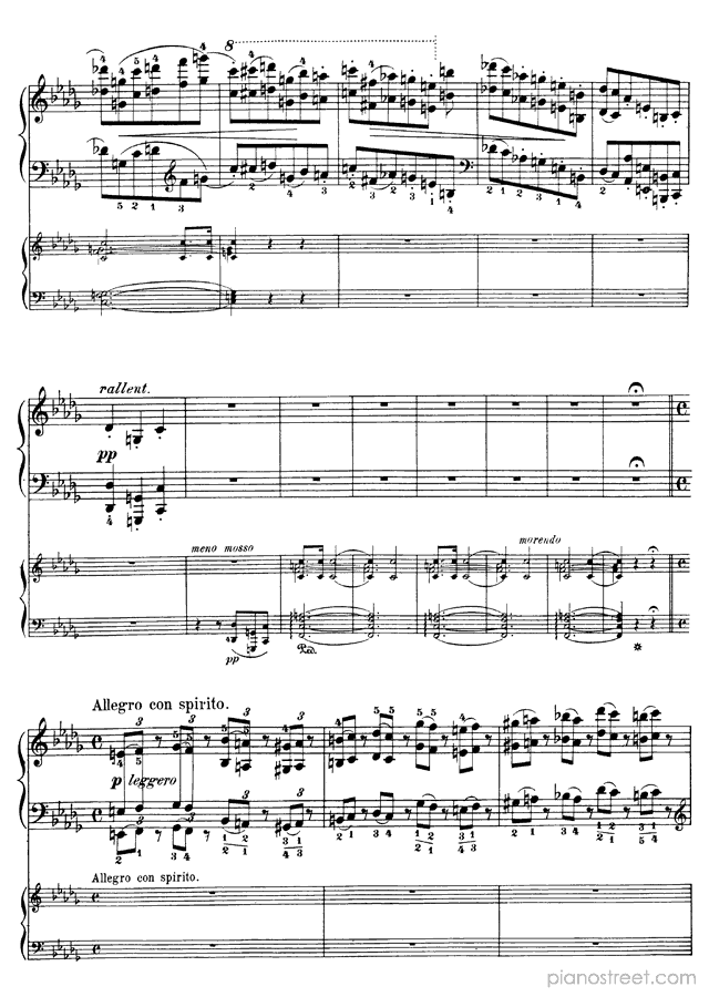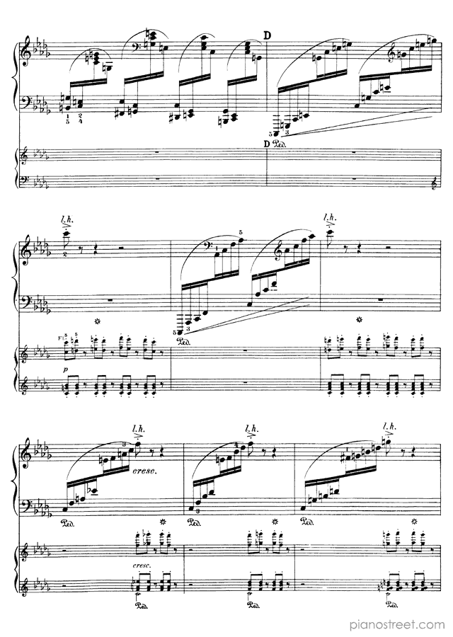 The second movement is in D flat major and A-B-A form. The outer sections are serene, almost pastoral, and, similar to the first movement, feature continuous interplay between the orchestra and the piano. The middle section is marked Prestissimo and flits and twirls with spritelike caprice, creating a contrast in tempo and character without detracting from the overall impression of a captured moment of contented happiness. The final movement is in rondo form and is decisively energetic and upbeat despite the minor key, thanks to numerous syncopations and middle-of-the-bar accents. Like the previous movements, capricious virtuosity contrasted with lyrical secondary themes interplay throughout. A virtuosic cadenza in octaves leads into the piano and orchestra coming together in a final passionate outburst, creating a glorious ending to a glittering and exciting concerto.