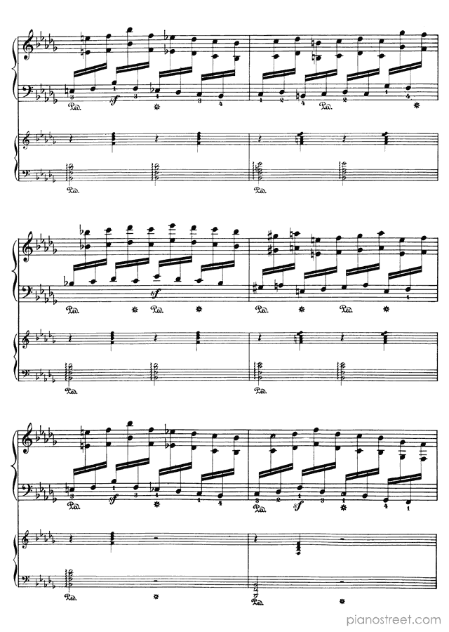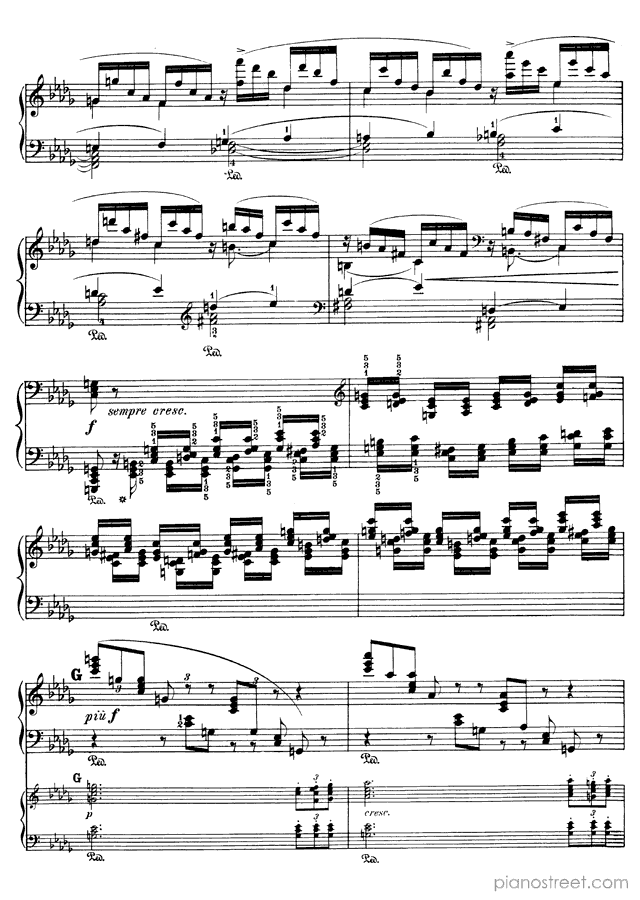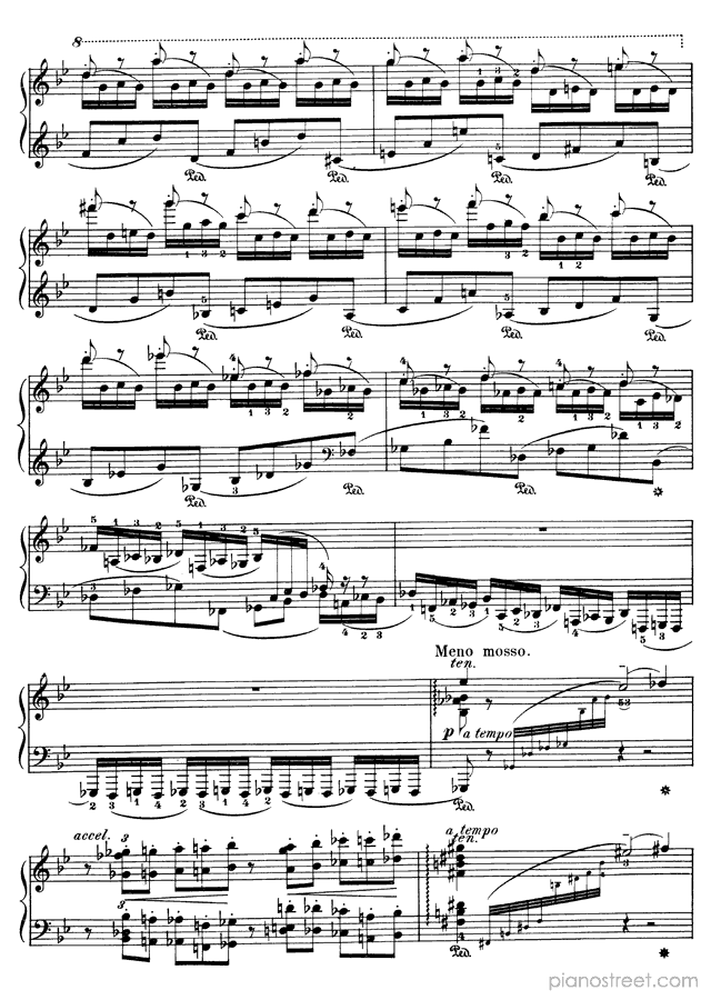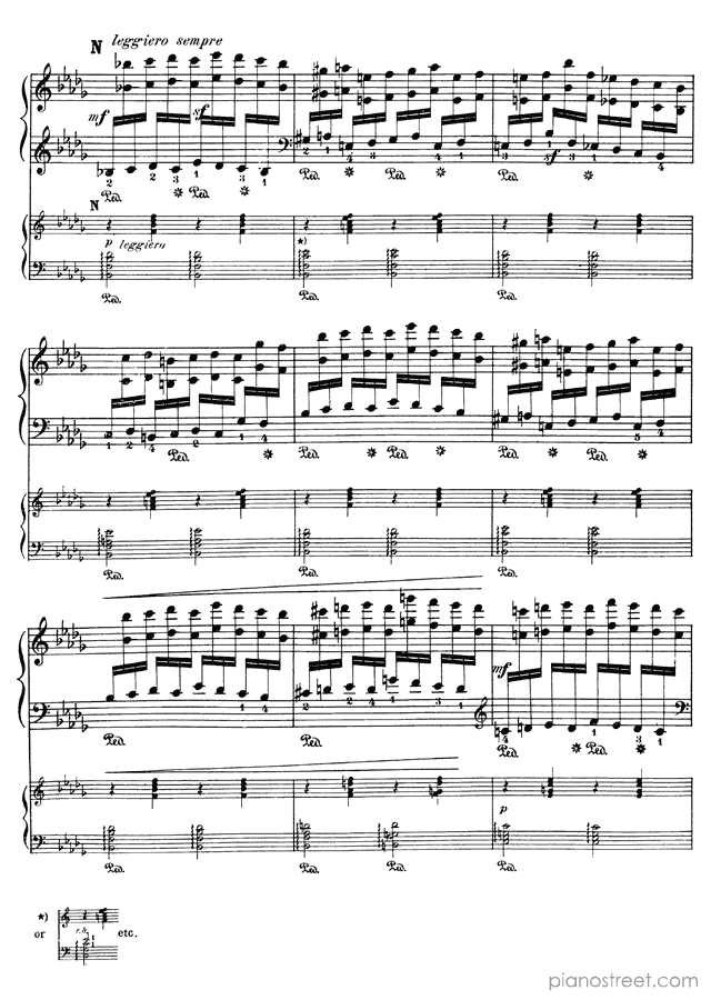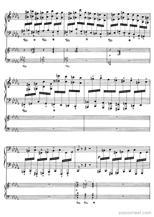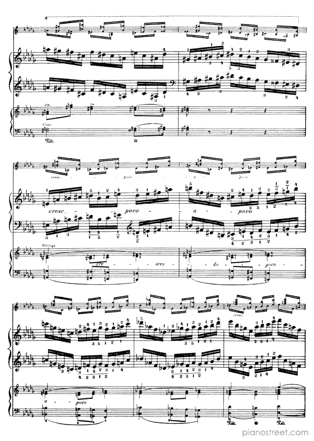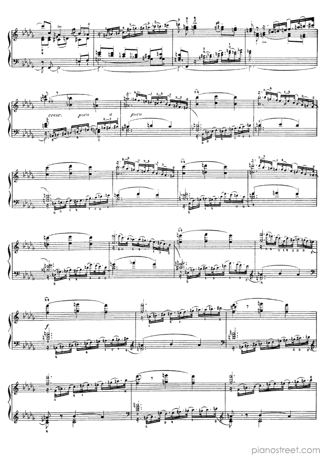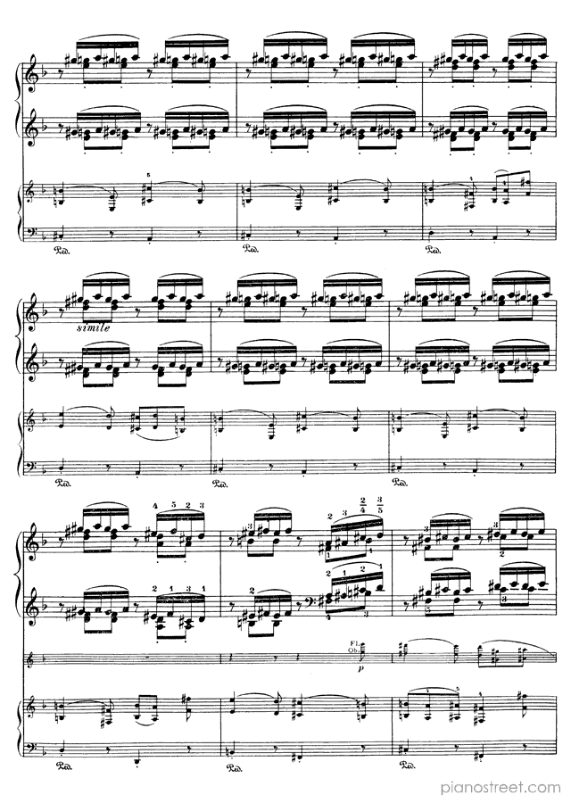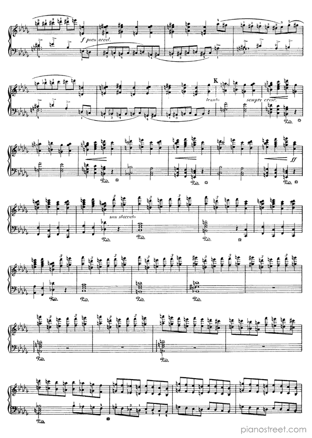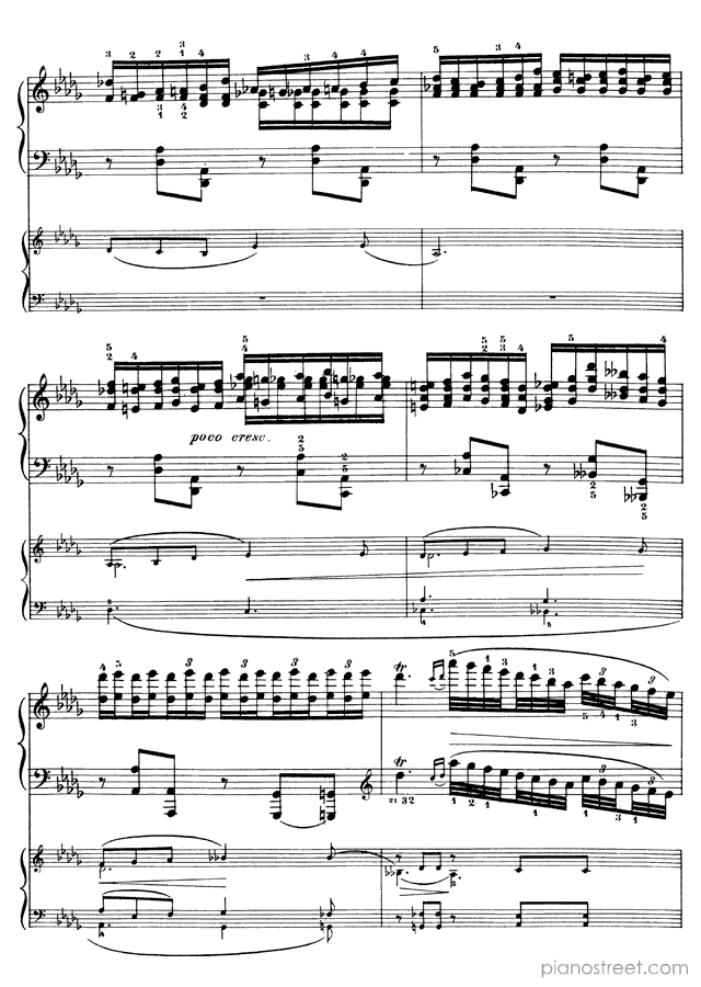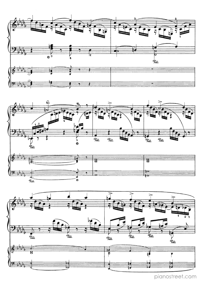 The second movement is in D flat major and A-B-A form. The outer sections are serene, almost pastoral, and, similar to the first movement, feature continuous interplay between the orchestra and the piano. The middle section is marked Prestissimo and flits and twirls with spritelike caprice, creating a contrast in tempo and character without detracting from the overall impression of a captured moment of contented happiness. The final movement is in rondo form and is decisively energetic and upbeat despite the minor key, thanks to numerous syncopations and middle-of-the-bar accents. Like the previous movements, capricious virtuosity contrasted with lyrical secondary themes interplay throughout. A virtuosic cadenza in octaves leads into the piano and orchestra coming together in a final passionate outburst, creating a glorious ending to a glittering and exciting concerto.