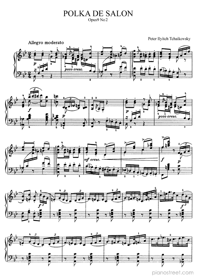 Peter Ilyitch Tchaikovsky: Polka de Salon Op. 9 in B-flat Major - piano sheet music to print instantly. This piece is level 8+ and was composed during the Late Romantic period.