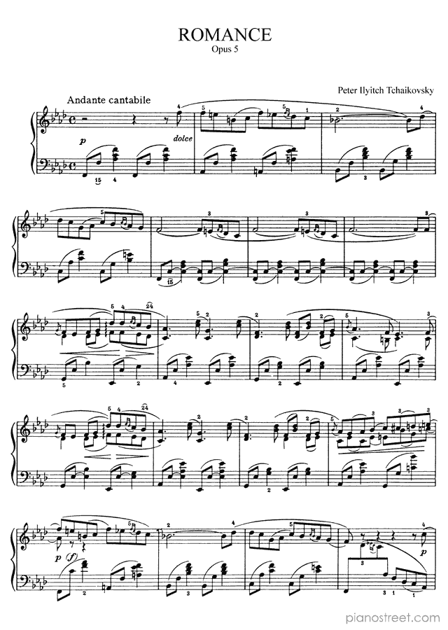 Romance Op. 5 in F Minor, a composition by the late romantic composer Peter Ilyitch Tchaikovsky who was born in 1840 and died in 1893. The piano score of this piece was first published in 1868 and is part of Tchaikovsky's Miscellaneous pieces.
