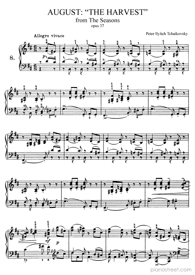 August - The Harvest in B Minor Op. 37 No. 8 by Peter Ilyitch Tchaikovsky. Sheet music and recordings of thousands of piano pieces by Peter Ilyitch Tchaikovsky and many other famous composers to view in your digital device, print out or listen to.